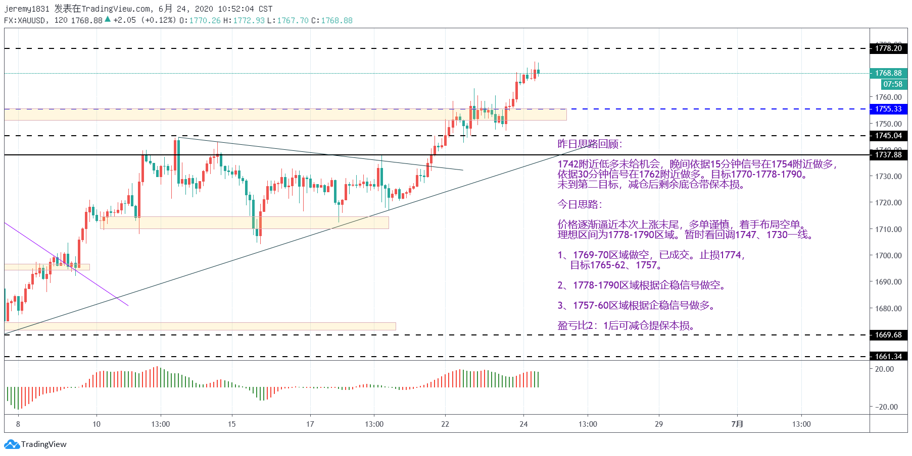 【策略为先】20200624黄金XAUUSD日内交易思路——高空为主,低多为辅。