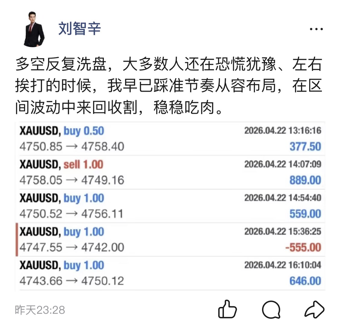 国际现货黄金开盘延续昨日回撤之力,先行走弱,其地缘局势的反复变动,令市场担忧美伊局势短期难以结束,使得海峡前景和通胀担忧仍在,而会限制金价反弹。另外,目前油价反弹回升,短期就算不回落,也将陷入震荡波动,加上美元指数日图反弹重回200日均线上方,多头重获优势,暗示短期金价面临震荡偏弱回撤的预期较大。从日线图来看,金价目前在持续运行在60日均线下方的同时,还再度运行在短期均线下方,空头占据优势,下方将重点关注中轨线支撑,跌破此支撑则有望回撤至4500美元或者4400美元关口,反弹至反弹突破60日均线阻力,则有望进一步触及5000美元关口,并加大再度刷新历史高点的预期。昨天多空反复洗盘,大多数人还在恐慌犹豫、左右挨打的时候,我早已踩准节奏从容布局,在区间波动中来回收割,稳稳吃肉。关注我,带你走出操作困局!如果你目前操作不理想,希望刘智辛能让你的投资少走弯路,欢迎前来沟通交流:chan8764 日内具体实时跟单指导关注实仓信息。